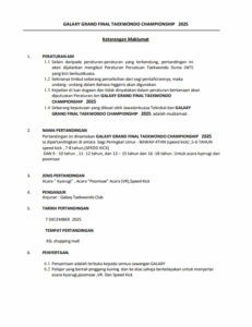 GALAXY GRAND FINAL TAEKWONDO CHAMPIONSHIP 2025 Welcome to our tournament registration system , you may see the information for this tournament below PHYSICAL FORM VIEW PDF BUNDLE VIEW LOCATION Tournament Bout Chart Boutchart will be available after the countdown runs out Interested in Purchasing Taekwondo Gear ? Buy with us using our special promo now Buy Now