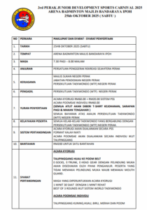 3rd PERAK JUNIOR DEVELOPMENT SPORTS CARNIVAL 2025 Welcome to our tournament registration system , you may see the information for this tournament below VIEW PDF BUNDLE VIEW LOCATION Tournament Bout Chart Boutchart will be available after the countdown runs out Interested in Purchasing Taekwondo Gear ? Buy with us using our special promo now Buy Now