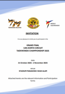 GRAND FINAL 13th KORYO CIRCUIT TAEKWONDO CHAMPIONSHIP 2025 Welcome to our tournament registration system , you may see the information for this tournament below VIEW PDF BUNDLE NO OBJECTION VIEW LOCATION Tournament Bout Chart Boutchart will be available after the countdown runs out Interested in Purchasing Taekwondo Gear ? Buy with us using our special promo now Buy Now