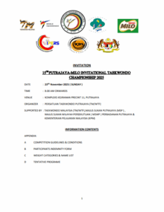 15TH PUTRAJAYA-MILO INVITATIONAL TAEKWONDO CHAMPIONSHIP 2025 Welcome to our tournament registration system , you may see the information for this tournament below VIEW PDF BUNDLE VIEW LOCATION Tournament Bout Chart Boutchart will be available after the countdown runs out Interested in Purchasing Taekwondo Gear ? Buy with us using our special promo now Buy Now